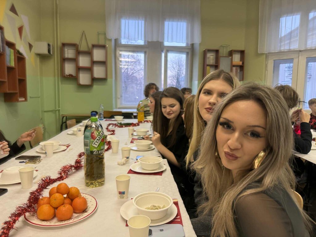 19 grudnia w naszej klasie odbyła się wyjątkowa wigilia, która wprowadziła wszystkich w świąteczny nastrój. Tego dnia wspólnie zasiedliśmy przy stole, pełnym tradycyjnych i pysznych potraw. Jedliśmy pierogi z kapustą, pierogi ruskie oraz barszcz z uszkami, które smakowały wyśmienicie.