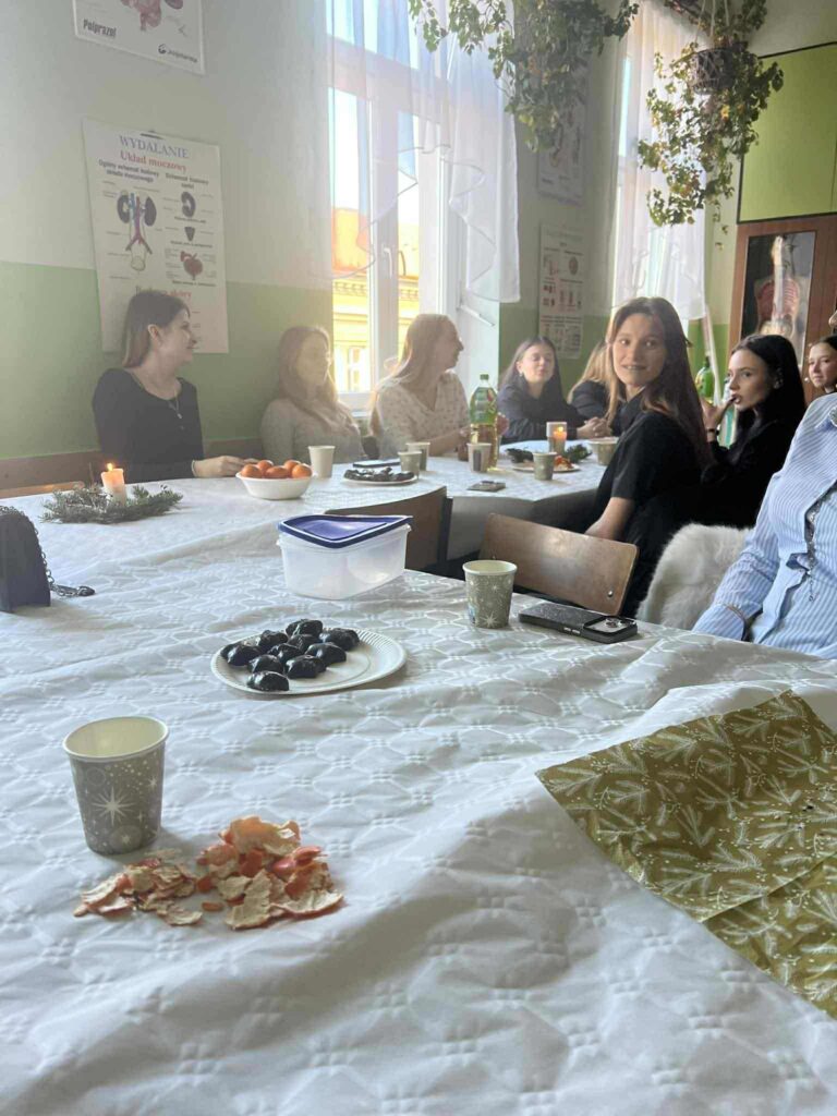 19 grudnia spotkaliśmy się na naszej ostatniej klasowej Wigilii. Odświętnie ubrani, składaliśmy sobie świąteczne życzenia oraz wspólnie spędziliśmy czas na rozmowie i śpiewaniu kolęd.